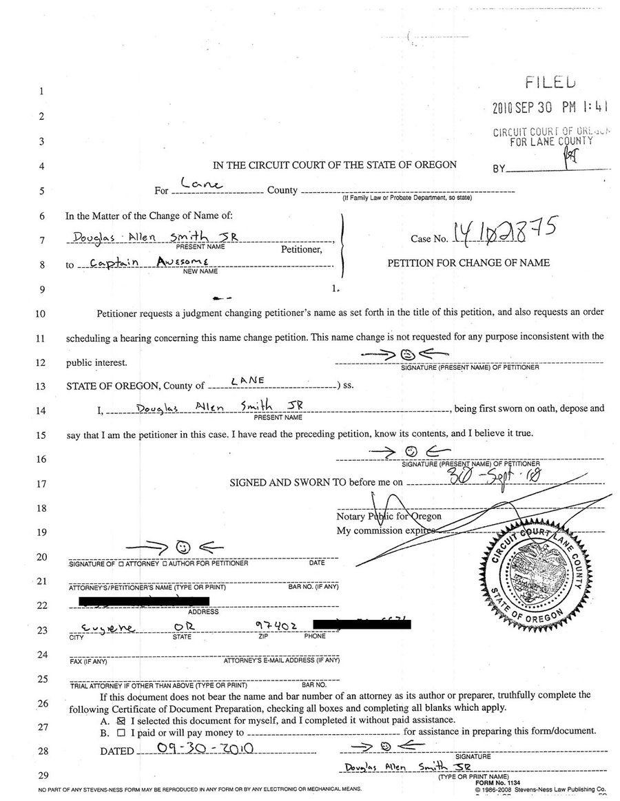 Deadspin has acquired the official petition for change of name that Captain Awesome, the Oregon man formerly known as Douglas Allen Smith, Jr., submitted to the Circuit Court of Lane County in late September. This is his legal signature.