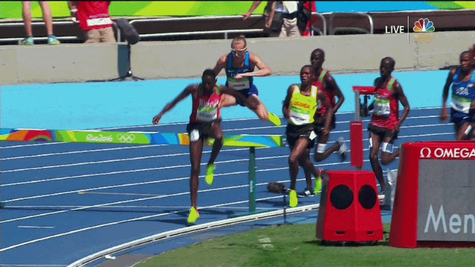 Well, you’re wrong as hell. Steeplechase, an event in which a field of runners must complete a race while navigating various obstacles, is not a safe space. Allow Ugandan runner Jacob Araptany, who participated in today’s 3,000-meter race, to demonstrate:
