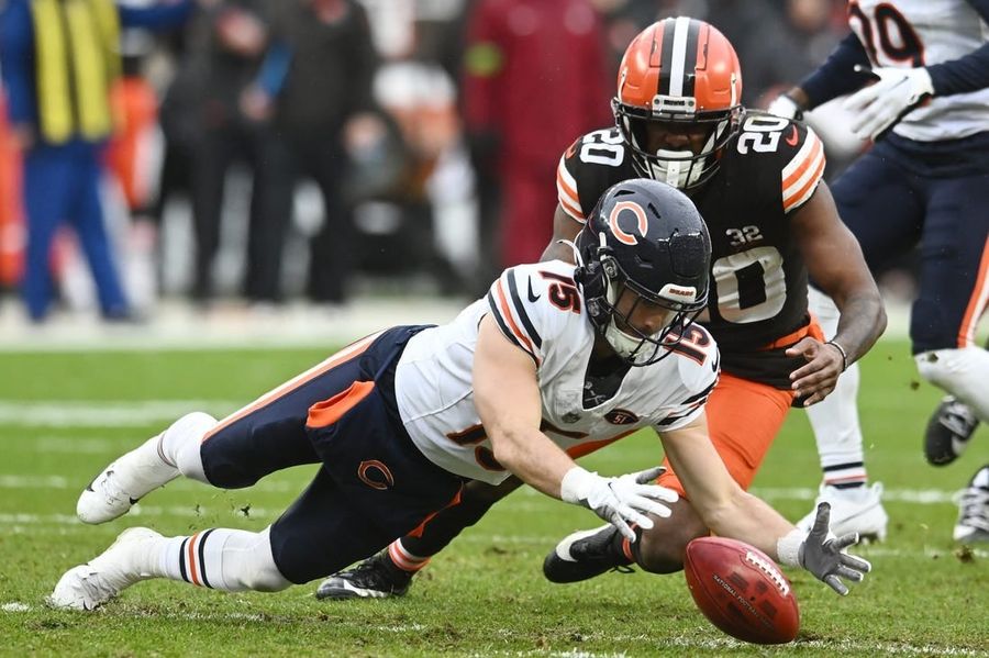 Dec 17, 2023; Cleveland, Ohio, USA; Chicago Bears wide receiver Trent Taylor (15) recovers a muffed punt as Cleveland Browns running back Pierre Strong Jr. (20) defends during the first quarter at Cleveland Browns Stadium. credits: Ken Blaze-USA TODAY Sports Veteran wide receiver and return specialist Trent Taylor has returned to the San Francisco 49ers, who have an opening after losing Ray-Ray McCloud last month to the Atlanta Falcons in free agency.