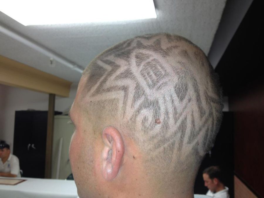 From Ryan, who says this was a fourth of July design meant to look like a firework. Ryan also that at the time of the e-mail, it was the friend's birthday the next day, so Ryan wanted him mocked on the internet as a gift. But now it's about six weeks later. Oops. Nice haircut, ya dummy!