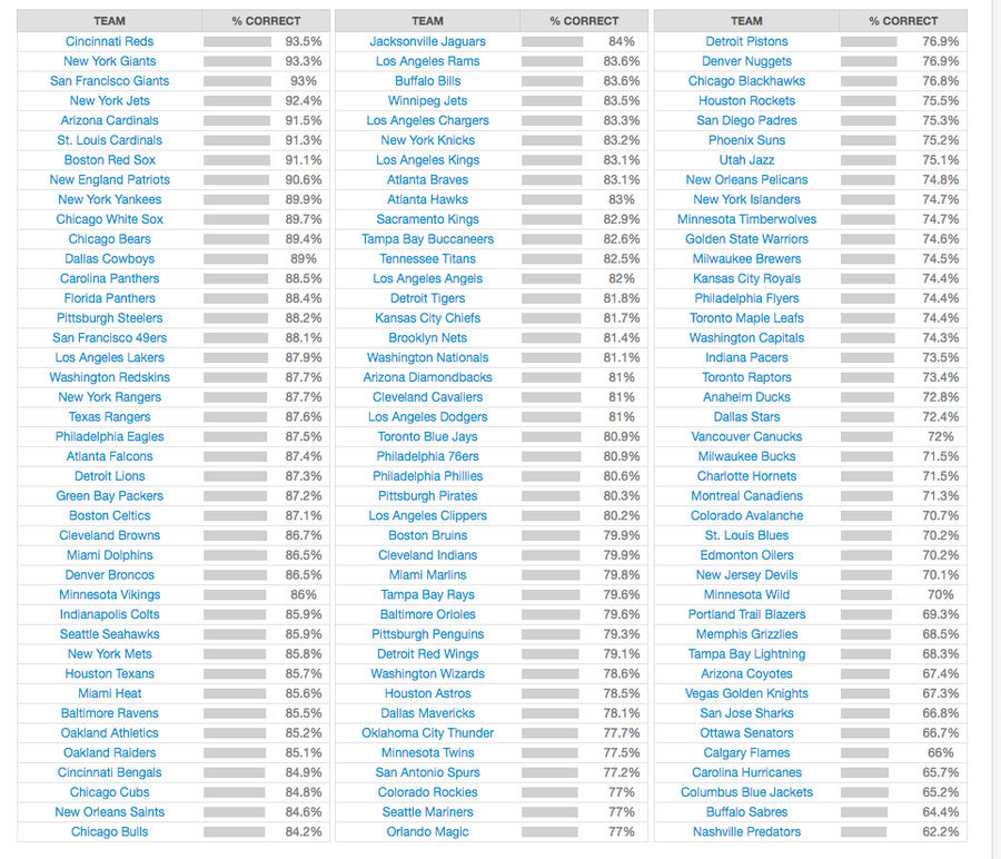 We can actually do this scientifically-ish. Here are the most commonly gotten answers in a Sporcle quiz asking you to name all the Big Four sport teams.