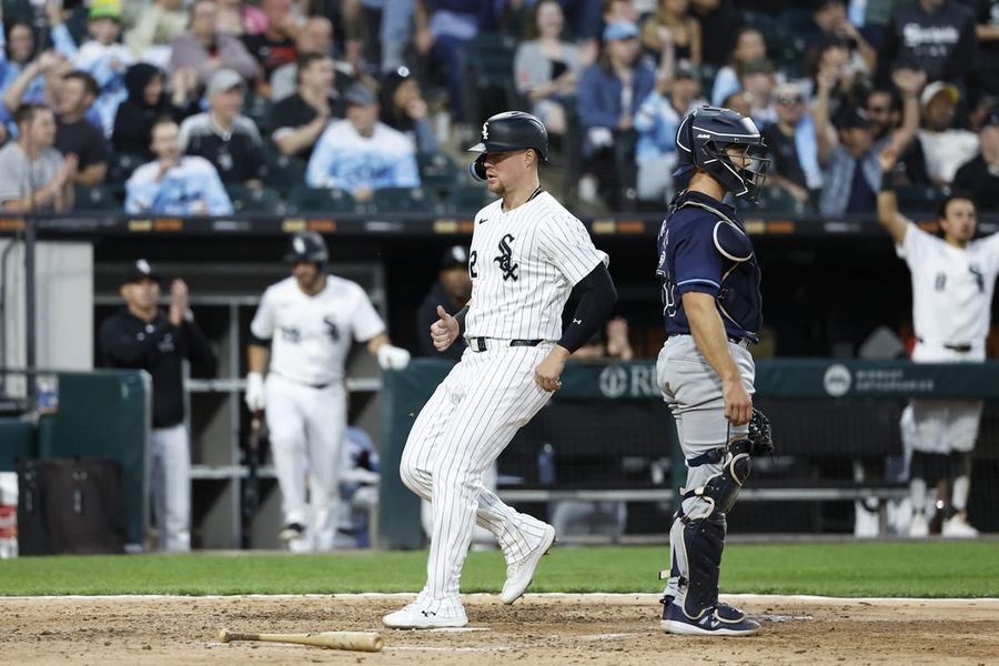 Apr 27, 2024; Chicago, Illinois, USA; Chicago White Sox first baseman Gavin Sheets (32) scores against the Tampa Bay Rays during the fifth inning at Guaranteed Rate Field. credits: Kamil Krzaczynski-USA TODAY Sports Andrew Benintendi went 3-for-5 with six RBIs and drilled a game-ending two-run home run in the 10th inning to propel the host Chicago White Sox to an 8-7 victory Saturday against the Tampa Bay Rays.