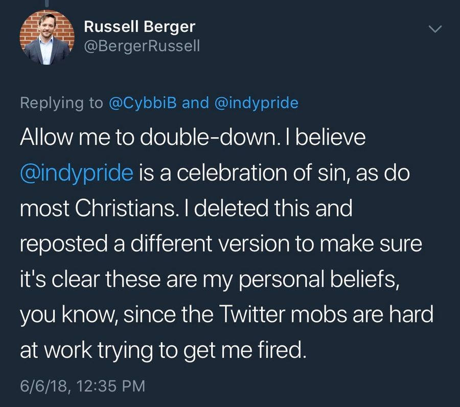Despite “doubling down,” Berger has since deleted his tweets, though the rest of his Twitter feed shows that he’s obsessed with fighting against big soda and scientific studies that cast CrossFit in an unfavorable light, and fighting for bog-standard hardcore Evangelical political issues. Per his CrossFit bio, he’s worked there since 2009. Per the CrossFit Twitter account, maybe not for much longer.