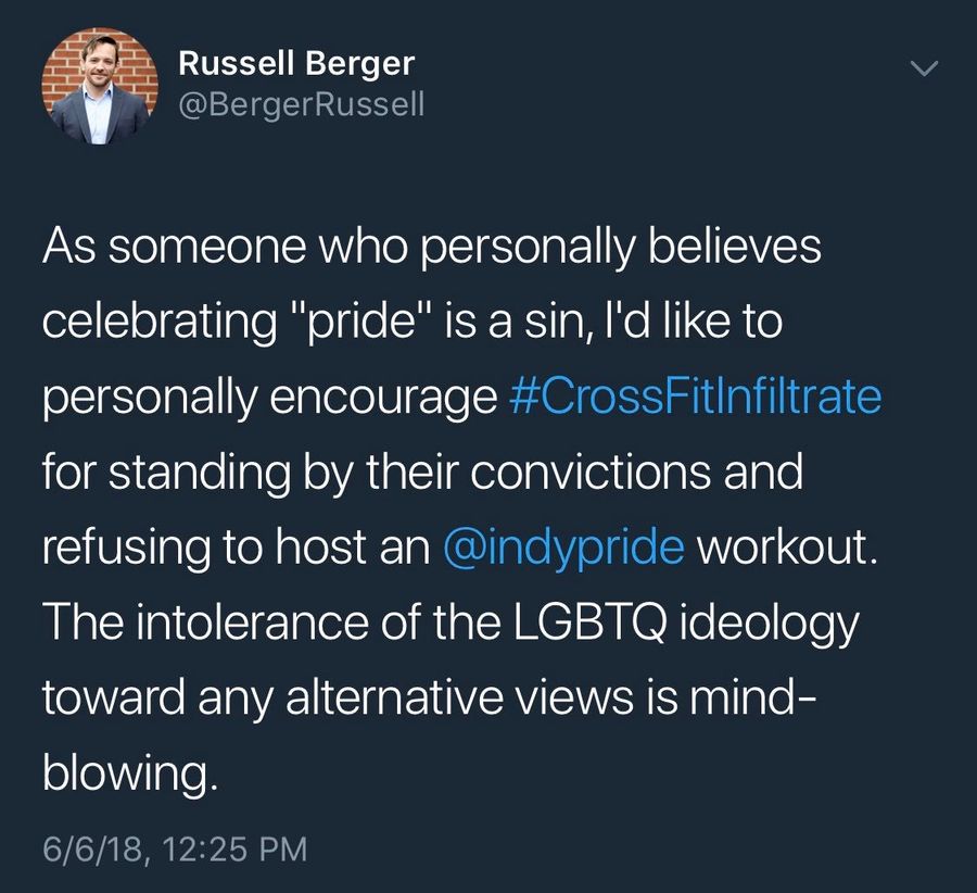 The entire CrossFit Infiltrate saga is, of course, gross and discriminatory, and it fits in as part of a long trend of anti-LGBTQ prejudice in this country and Indiana in particular. The story would have stopped there, but it achieved escape velocity this afternoon, when CrossFit’s Chief Knowledge Officer Russell Berger cranked the homophobia up to 11.