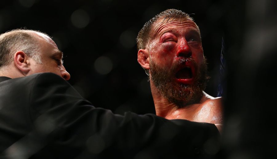 Cerrone was visibly hurt after the second round, but his injuries only became truly grotesque between rounds. As he tells it, he cost himself the chance to keep fighting with what would be later ruled as a broken orbital bone when he blew his nose and inflated his face. Because his nose was broken, the air he tried to blow out was instead trapped in his sinus cavity.