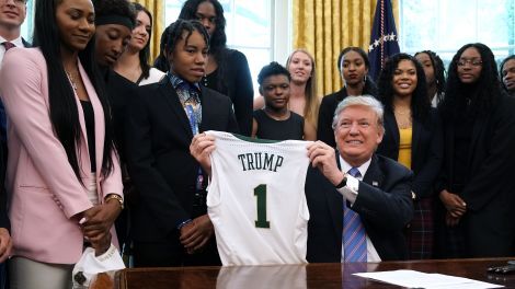 “It’s a big deal,” Trump told Army’s team and coach. “I hope it doesn’t become the story but it is a big story because I’m going to look at doing a waiver for service academy athletes who can get into the major leagues, like the NFL, hockey, baseball. We’re going to see if we can do it and they’ll serve their time after they’re finished with professional sports. And that’ll make things, can you imagine this incredible coach with that little asset?” Trump had by that point turned away from the microphone so that he could honk the last few words at Army coach Jeff Monken.