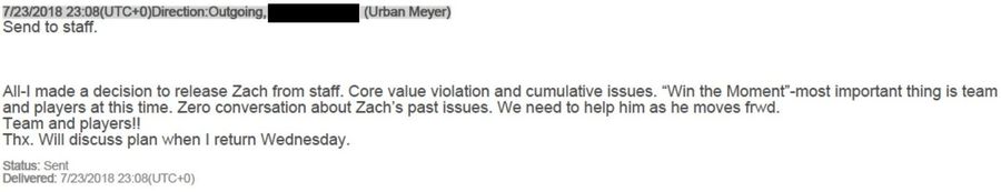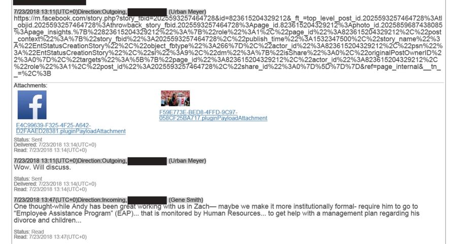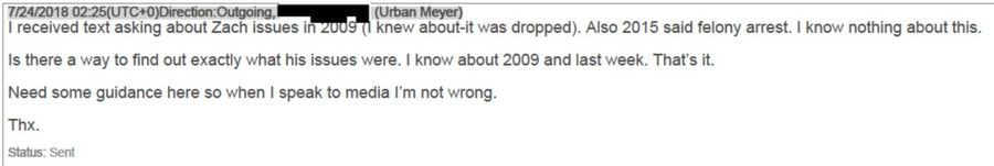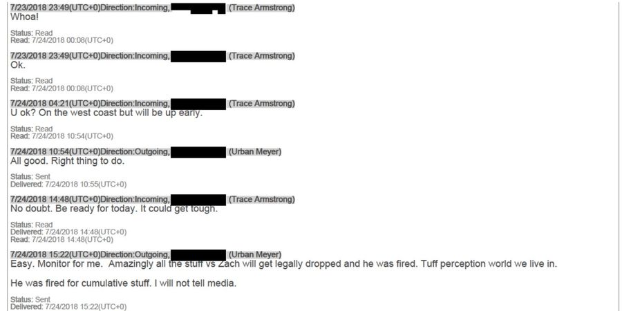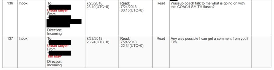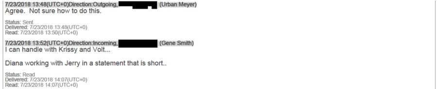 The document dump was emails and text messages going back several years and included everything from extended chats about recruiting athletes, to emails from Ohio State fans insisting Meyer not be fired, to updates on Zach Smith’s fantasy football team. Tucked in there were message sent between Meyer, athletic director Gene Smith, then-defensive coordinator Greg Schiano, and others around the time that McMurphy first broke the story and the days following. Here is what they show.