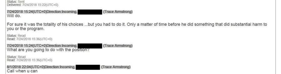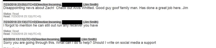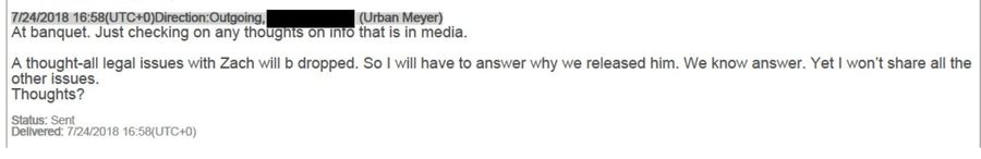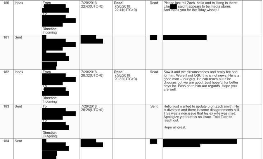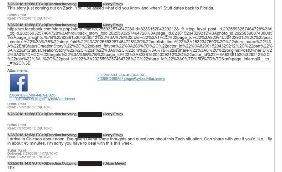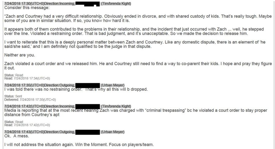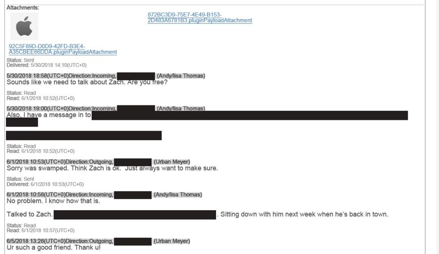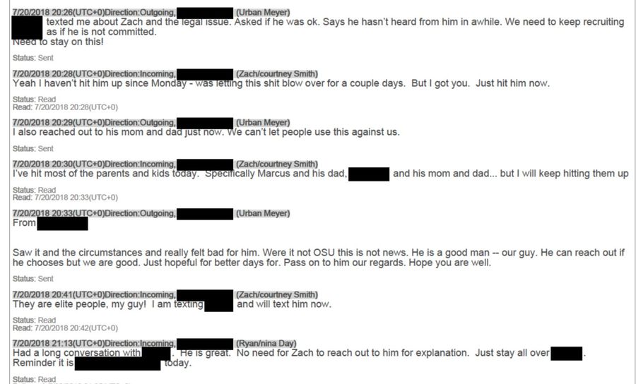 These are dated July 20. One of the people in the conversation is labeled as “Zach/courtney smith” but it’s doubtful that it was Zach Smith or Courtney Smith on the other end given the conversation the topics are “Zach and the legal issue” as well as athletic recruits. This is three days before the McMurphy report: