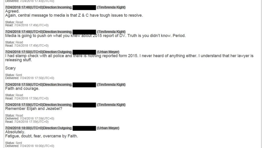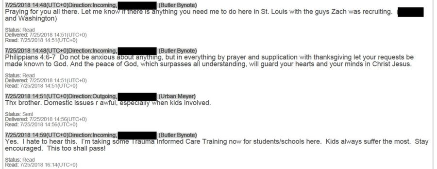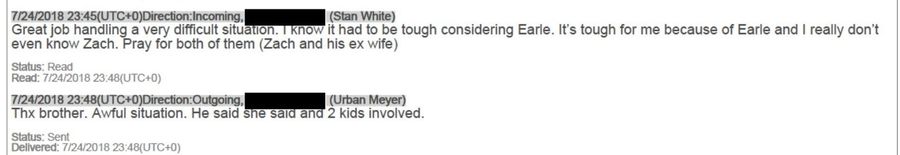 Hours later, Meyer has this text chat. It contains a reference to Earle, which likely means Zach Smith’s grandfather, Earle Bruce, a legendary Ohio State football coach and mentor of Meyer. Meyer calls what happened a “he said she said.”