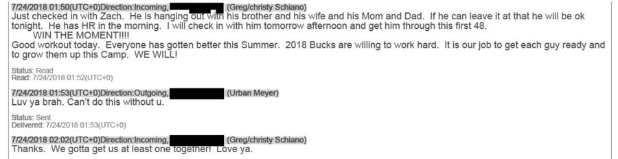 Assistant coach Greg Schiano reminds Meyer to “WIN THE MOMENT!!!!”