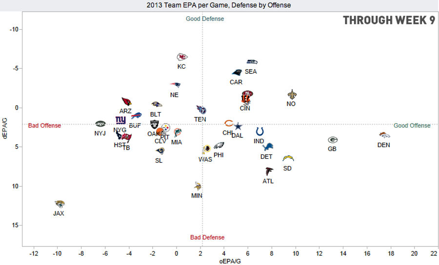 The chart above, from Brian Burke's Advanced NFL Stats, shows each team's expected points added (EPA) on both sides of the ball (quick reminder, the dotted lines are set at the league average; for a good explanation of how EPA works check out the Times's article on the 4th Down Bot they created in collaboration with Burke). We last looked at these figures after Week 9; for comparison's sake, here's how the chart looked then: