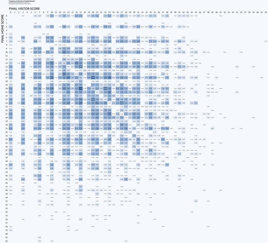 On Friday, FiveThirtyEight ran a post that collected data on nearly 200,000 English soccer scores from the last 126 years. The most common score was a 1-1 draw, there were more than 13,000 0-0 draws, and an alarming number of games where one side didn't score at all. The most common reaction was that this was confirmation that, taken as a whole over the last century, soccer really is sort of dull. That in mind, a redditor called TortiseWrath made a similar graphic for all NFL scores since 1970.
