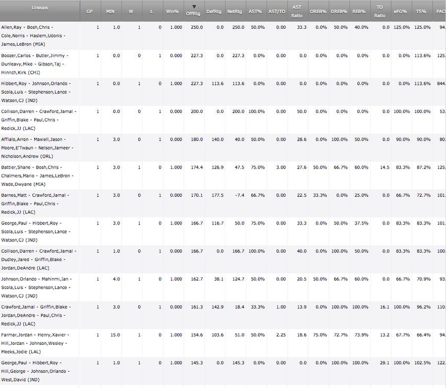 Below is a (very tall, sorry; click to expand) table of the top five-man units in the league this year sorted by offensive efficiency, via NBA.com. But since there have only been three games, this list is not very much use yet because most non-starter/closer units won't have played many minutes together—the top units here have outlandish efficiencies over one or two minutes. Except for the Lakers' bench in the fourth quarter last night.