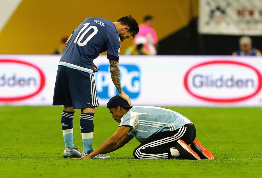 Fox cameras didn’t show this enterprising Idiot On The Field, who clearly regards Messi as some sort of soccer god. Given his free kick shortly before, this is at least up for discussion, and our man here bowed down, took a selfie, and had plenty of time with Messi.