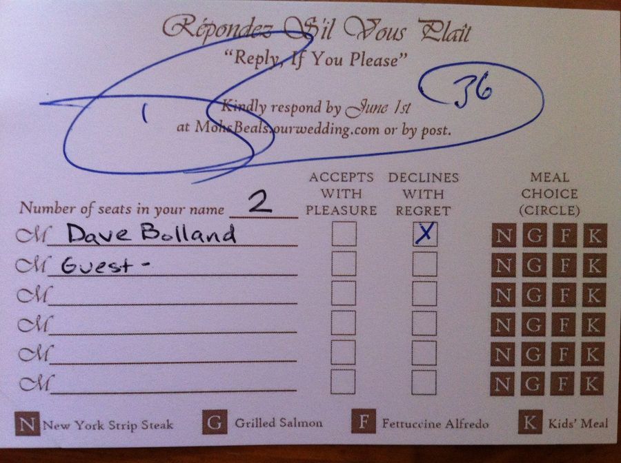Here's an RSVP posted on Reddit this morning, in which Peyton Manning regretfully declined to attend a fan's wedding. Such a polite young man!