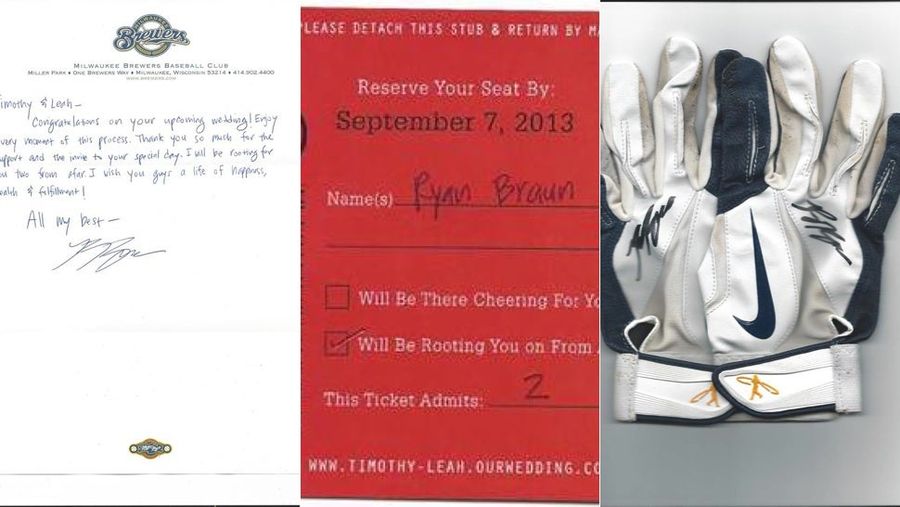 Sometimes you get even more than a signature. Tim (a different one) invited Ryan Braun to his wedding. This July, Tim got back an entire package from Braun. It included the RSVP, a handwritten note, an autographed baseball card, and signed batting gloves.