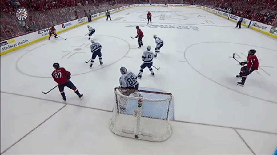 Ovechkin, in the left circle, doesn’t have to do anything but exist in order to seriously distract Anthony Cirelli, defending in the high slot—look how many times Cirelli looks back over his shoulder. Evgeny Kuznetsov, down low, darts in front of net, not only getting Anton Stralman and Ryan McDonagh to lean the wrong way for split second, but screening Andrei Vasilevskiy. Even Backstrom is looking off Alex Killorn. “It’s all about, try to look somewhere else,” Backstrom said, “and pass it the other way.”