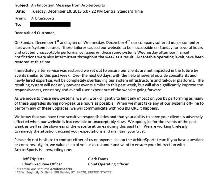 On two different days this December, ArbiterSports was completely borked. Inaccessible. The servers had somehow been Triplette'd. So, earlier today, customers of ArbiterSports received an apologetic email explaining the site's problems. While it's funny to imagine an already-flustered Triplette typing this sad email out, he probably didn't, but hey, his signature is at the bottom, like an exclamation mark to this system failure.