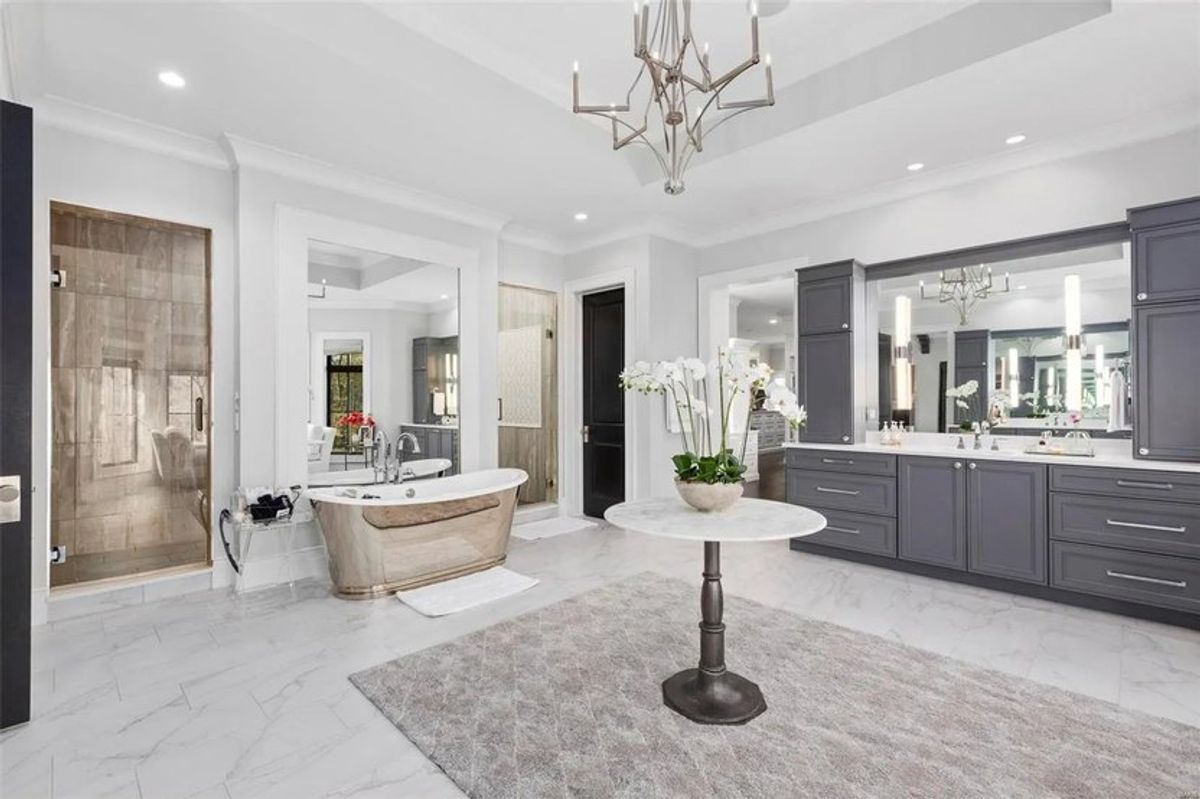 Set on a pristine 7-acre lot, Edmonds’ mansion is a perfect blend of sleek modern design and timeless elegance. The home features seven bedrooms and eleven bathrooms, with soaring coffered ceilings and massive floor-to-ceiling windows that let in an abundance of natural light. High-end materials like marble and solid wood add to the refined aesthetic, while custom fireplaces and built-in bars create a warm, inviting atmosphere.
