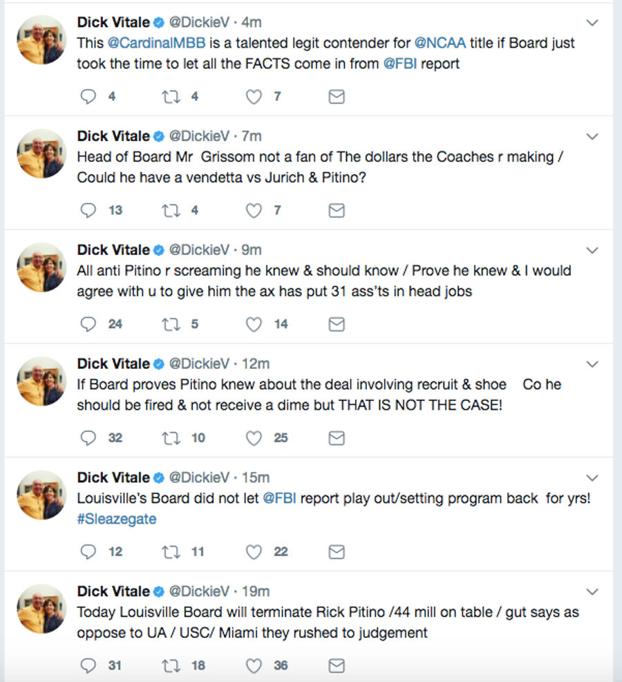 Should the worst come to pass for Pitino and Louisville down him in court, he can at least take solace in the fact that he’ll always have Dickie V in his corner.