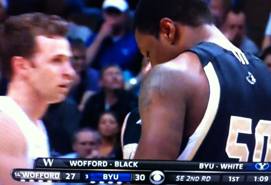 • Tipster Andrew B. found it unnecessary for CBS to point out the difference in colors between BYU and Wofford, so he sent a screen grab, subject-lined "Stating the obvious?" [ Wofford.edu]