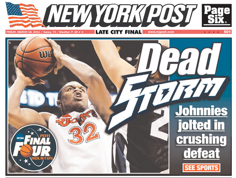 • The New York Post went with the understated headline of "Dead Storm" regarding St. John's "crushing 86-71 loss to Gonzaga." Senior Dwight Hardy of The Bronx said, "I mean, we're crying right now." Such devastation. Here's hoping Dwight is able to find some sense of normalcy in this cold, cruel world. [ New York Post]