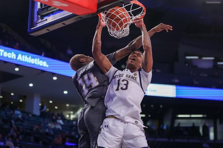 In the first half, Georgia Tech jumped out to a 29-22 lead before a 9-0 run over the final 3:56 gave Notre Dame a two-point lead at the break. Notre Dame shot 44.8 percent (13-for-29) from the field in the first half, led by nine points from Shrewsberry.