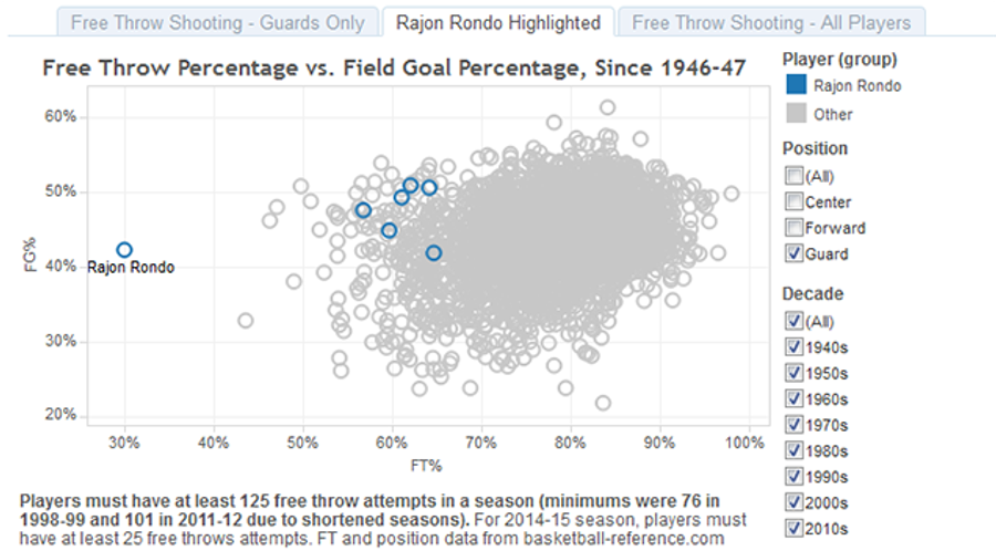 Yes, that lone data point on the far left is how Rondo's season compares historically to those of fellow guards. In order to qualify for the NBA free-throw title, a player must make at least 125 free-throws (those numbers dip to 76 and 101 for the strike shortened 1998-99 and 2011-12 seasons, respectively). However, because I wanted to look at free-throw futility rather than free-throw success, I did the inverse of the "leaderboard" metric and changed free-throws made to free-throws attempted when deciding whom to include in this analysis (for the 2014-15 season, players were required to have attempted 25 free-throws).
