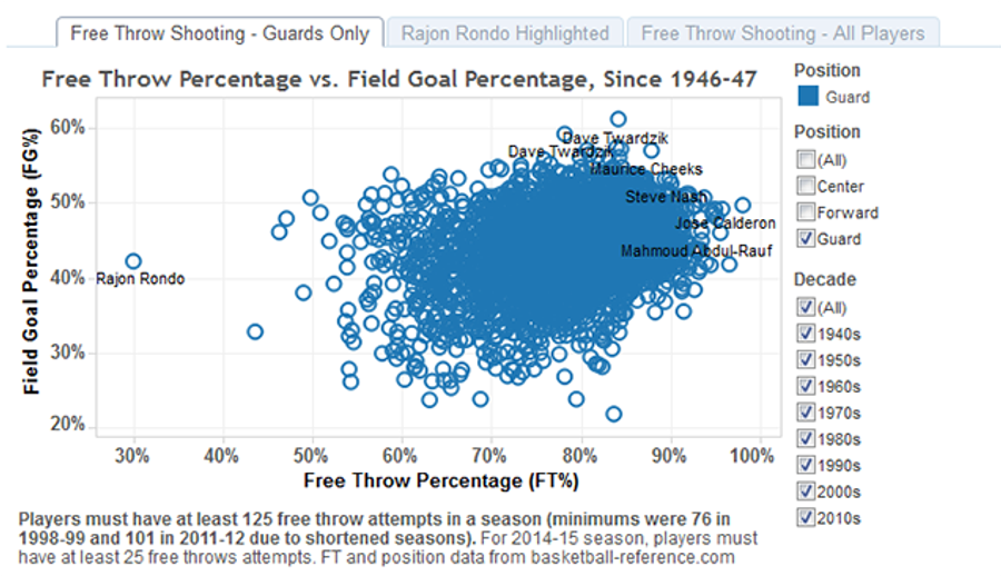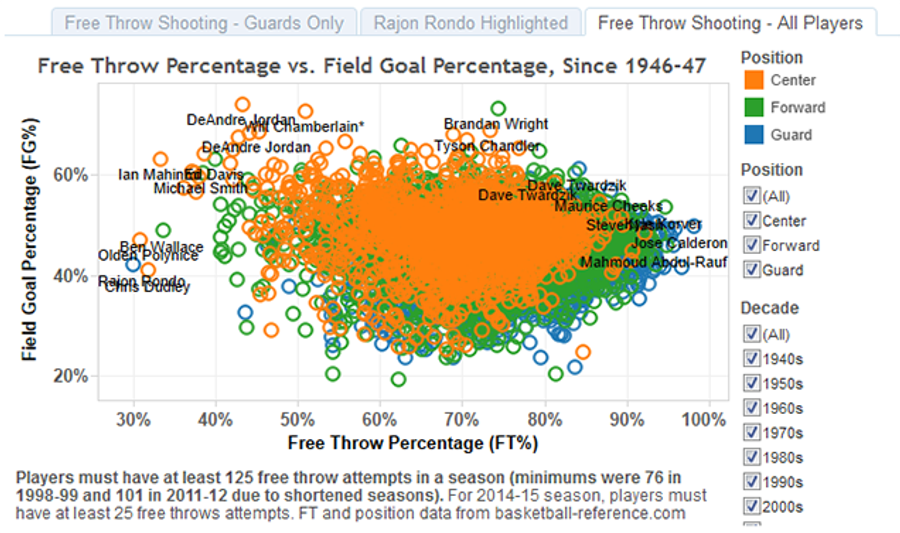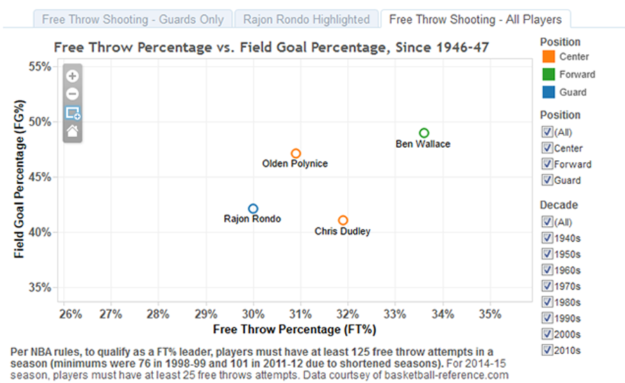 Below are several screenshots of data visualizations that show just how historically bad his free-throw shooting has been thus far. (For the full, dynamic visualizations, click here.)