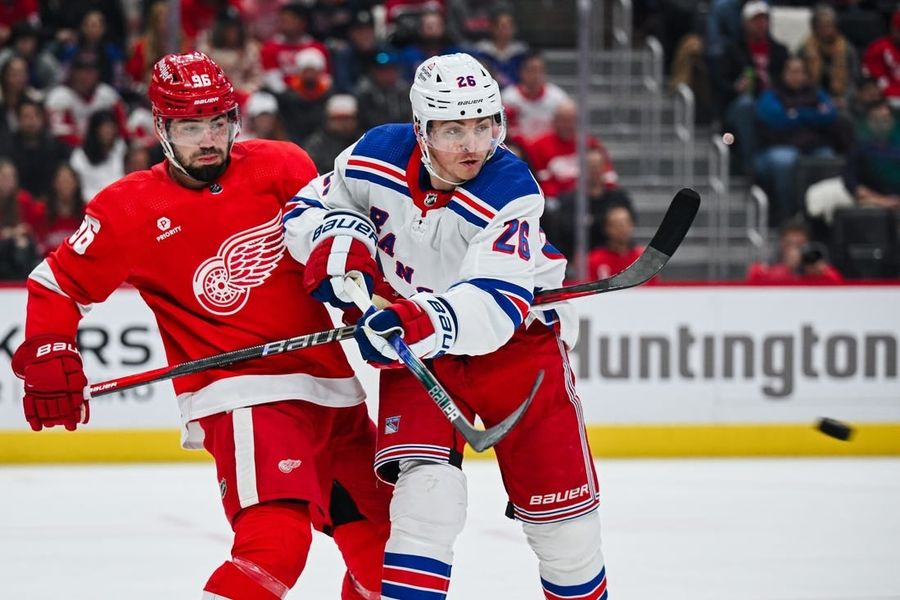 Apr 5, 2024; Detroit, Michigan, USA; New York Rangers left wing Jimmy Vesey (26) and Detroit Red Wings defenseman Jake Walman (96) battle for the puck during the first period at Little Caesars Arena. credits: Tim Fuller-USA TODAY Sports Barclay Goodrow scored two goals to lead the New York Rangers to a 4-3 road win over the Detroit Red Wings on Friday.