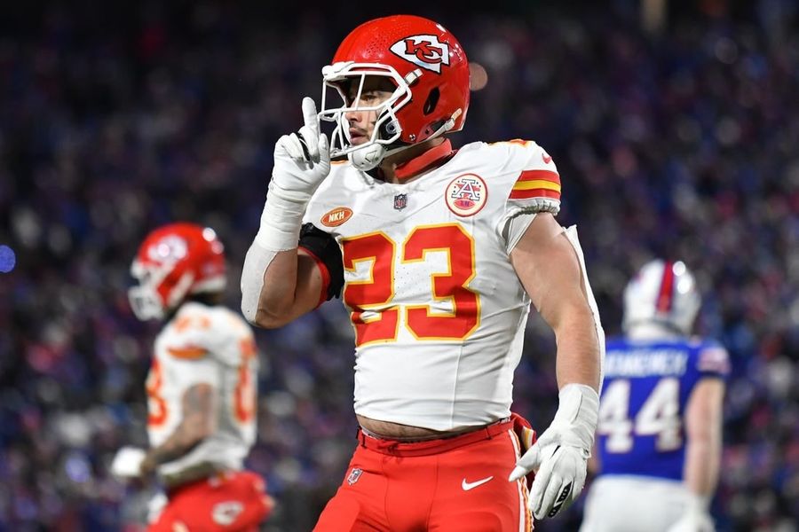 Jan 21, 2024; Orchard Park, New York, USA; Kansas City Chiefs linebacker Drue Tranquill (23) reacts against the Buffalo Bills in the second half of the 2024 AFC divisional round game at Highmark Stadium. credits: Mark Konezny-USA TODAY Sports The Kansas City Chiefs are re-signing linebacker Drue Tranquill to a three-year, $19 million contract with $13 million guaranteed, according to multiple media reports on Thursday night.