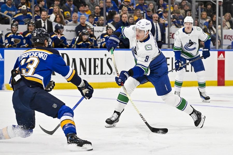 Demko kept the score tied by denying Blues forward Nathan Walker's clean break-in with 5:40 left in the second period. Then 2 minutes later, Binnington had to make a similar stop on Blueger, who stole the puck and shot from point-blank range.