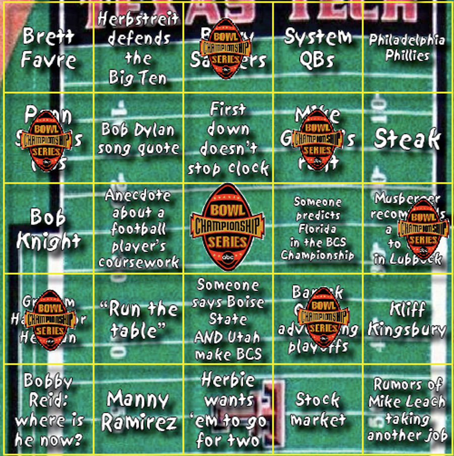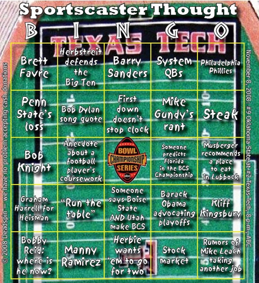 The Big XII has thirteen teams in the Top 10, and this is just another night in which two of them square off on a Saturday night. The undefeated Red Raiders get their second straight prime-time big game against the once-defeated Cowboys. Brent Musberger and Kirk Herbstreit brand cows with their initials. What the world needs now, is jump, sweet jump. * * * * *Fourth Quarter 11:17 β Also, I don't do this enough (or, well, ever) but we got some pretty solid hits on the bingo sheet, so here's how we did tonight, based on what you and I saw tonight: