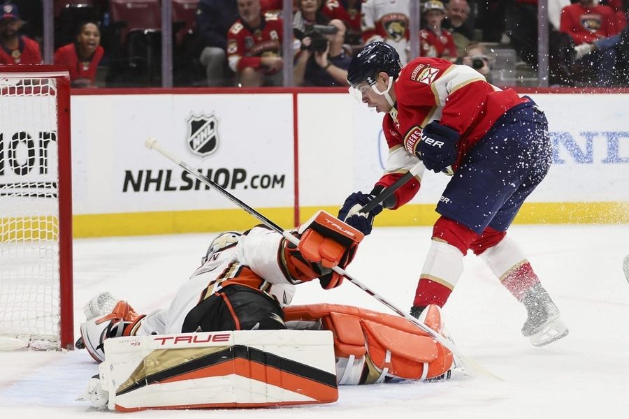 Panthers backup goalie Anthony Stolarz was in net for Florida and made 21 saves against Anaheim, where he spent parts of the past four seasons.
