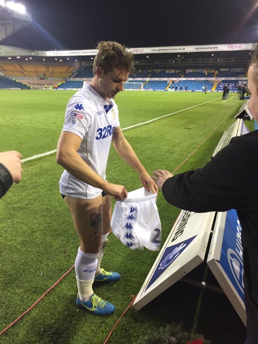 After Leeds United’s 1-0 win today over Brentford, defender Gaetano Berardi was approached by a fan asking for his shirt. Giving away a game-worn shirt is apparently frowned upon by Leeds (as is also the case for Manchester United, whose players were told earlier this year that giving fans their kits’ shirts is “ not cost effective”). But Berardi didn’t let rules get in the way of his generous spirit, and peeled off his shorts to give the fan instead.