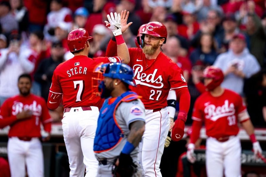 Cincinnati Reds outfielder Spencer Steer (7) high fives Cincinnati Reds outfielder Jake Fraley (27) after hitting a 3-run home run in the eighth inning of the MLB baseball game between the Cincinnati Reds and New York Mets at Great American Ball Park in Cincinnati on Saturday, April 6, 2024. credits: Albert Cesare/The Enquirer/USA TODAY NETWORK / USA TODAY NETWORK Spencer Steer credited the Cincinnati Reds' ability to put the ball in play for their latest comeback win.