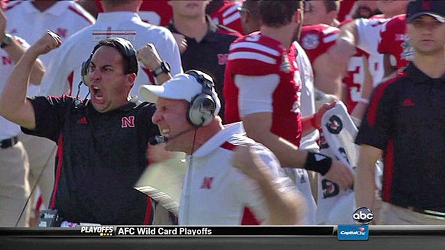 Here's Nebraska coach Bo Pelini and the rest of his staff reacting with a bit too much emotion after Georgia missed a field goal late in the first half. Watch »