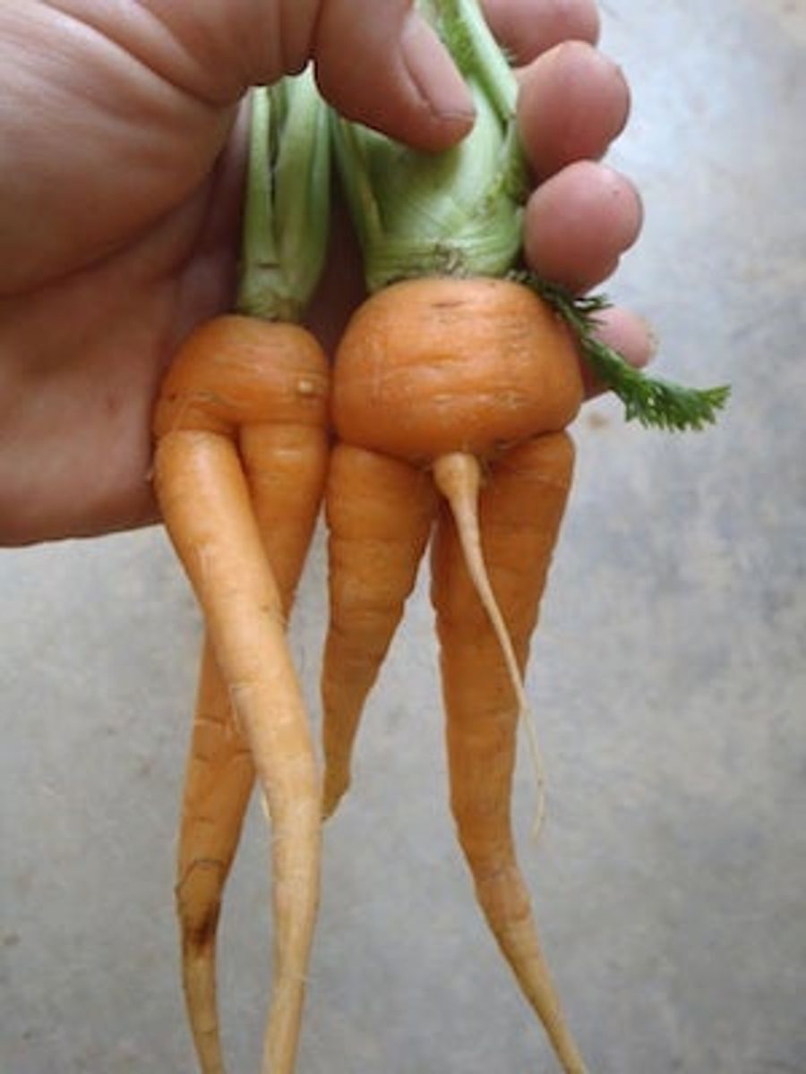 From Stephen, who reports, "I have no information concerning the origin of this dong." The ground, probably, carrots grow in the ground. Bonus points for the adjacent carrot, which looks like a pair of crossed legs. Finally: A pair of carrots that looks like a middle-aged couple from the waist down.