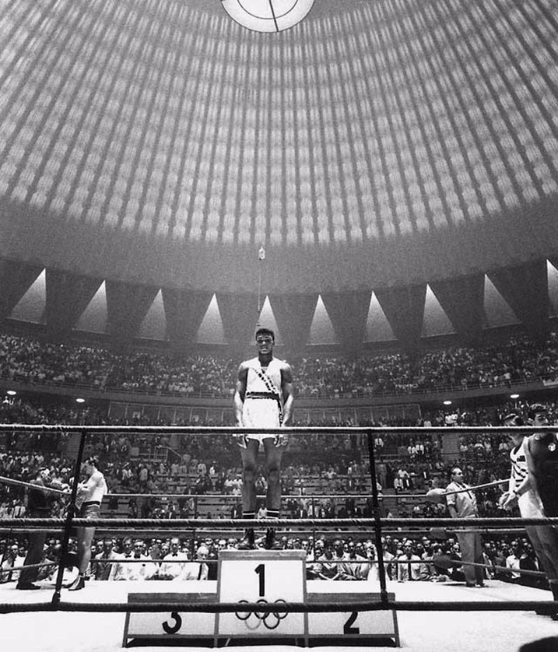 Newman was equally impressed by the Palazzo dello Sport, Pier Luigi Nervi’s magnificent modern dome that doubled as the basketball venue. The natural light that streamed into the structure seemed to bathe the fighters in an ethereal glow. When Ali mounted the medal podium, Newman composed a timeless image that introduced the original GOAT to the world.
