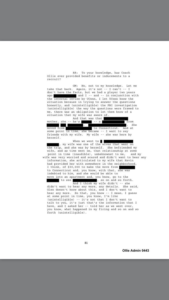 In terms of what UConn is citing from the NCAA investigation to use in its justification for Ollie’s firing, this is all the school is using to bolster its “just cause” claim. Miller also told investigators that his wife told him the mother of a player claimed Ollie had her paid $30,000 in moving and living expenses to be closer to her son during his playing days, but UConn is not pursuing that claim in its case because as far as the upcoming legal case goes, it has to be able prove all these things happened.