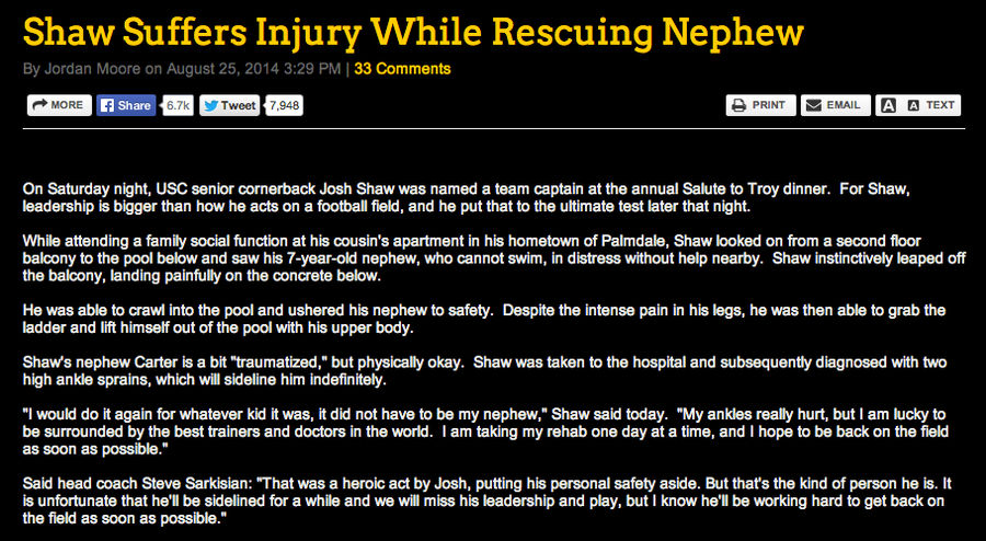 Shaw's original story was published on the Trojans' blog on August 25; the story has been deleted. You can find a screencap of it below. It came into question Tuesday morning when head coach Steve Sarkisian said there had been multiple phone calls contradicting Shaw's telling of the events.