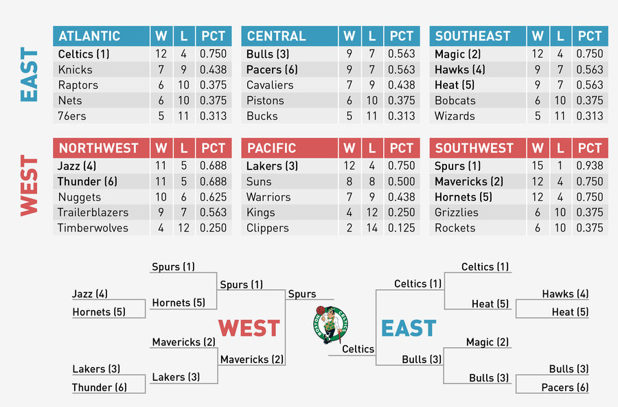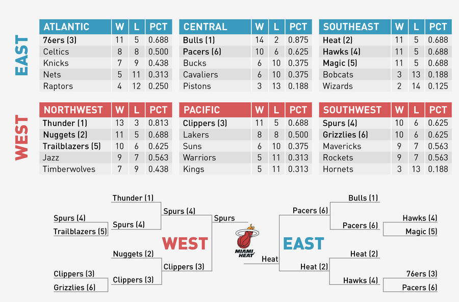 The NFL-style standings are remarkably similar to what actually happened: Of the 12 teams that took a six seed or higher in the real playoffs, 11 make the playoffs here. Of these 11 teams, nine are within one spot of their actual playoff seed. The Milwaukee Bucks make the playoffs as a six (they were an eighth seed in real life), and the Denver Nuggets break from a three seed to a five seed.