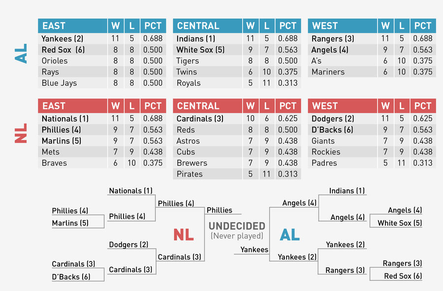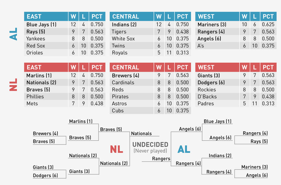 The Washington Nationals' 9-7 record is good enough for the two seed in the NL, thanks to a ridiculous amount of league-wide parity (17 teams finish with seven to nine wins). After a first-round bye, they top the Giants and Braves in successive home games to make it to the World Series Game. The real-life Nationals–with no Strasburg, Harper, or Gio Gonzalez–were still one year away from competitiveness. They finished 80-81 and missed the playoffs by 9.5 games