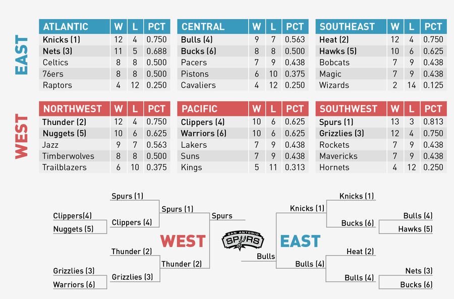 The San Antonio Spurs take a four seed but upset the Thunder at home in the playoffs to advance. The two teams met in the conference finals in the actual season, with the Spurs going up 2-0 before dropping the next four.
