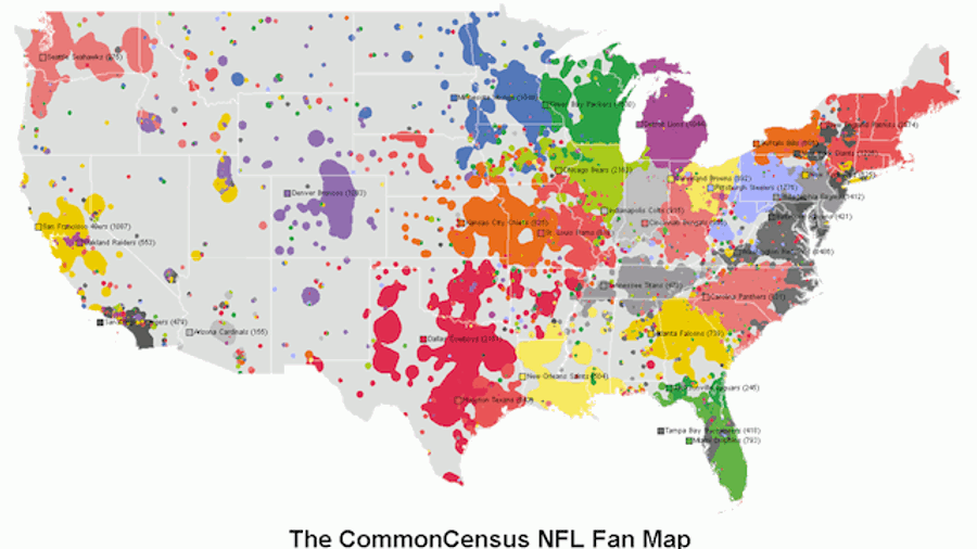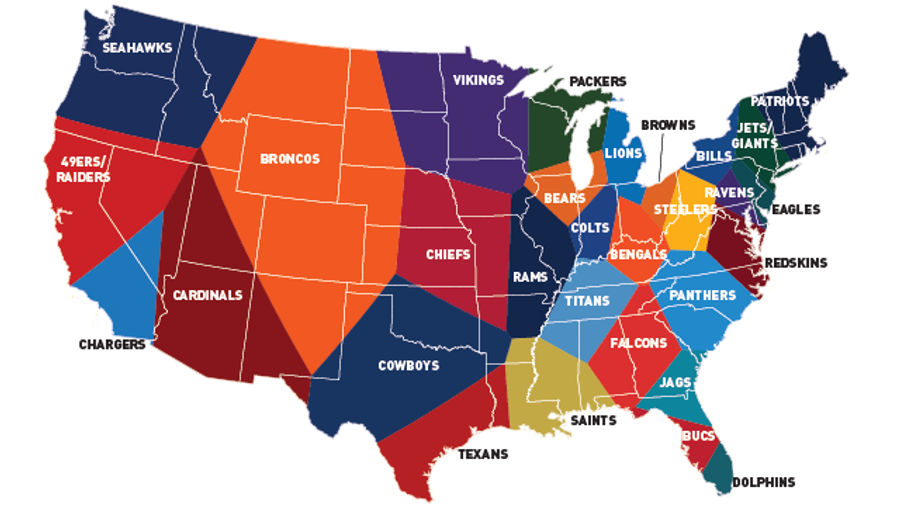 People often split up NFL fanbases by state. As in: Michigan=Lions, Wisconsin=Packers, Illinois=Bears. There are two reasons for this. First, it's easy. We're used to looking at maps and dividing stuff up along state lines (like electoral votes). Second, most major college sports are dominated by large state schools, with rivalries that often do follow these lines.