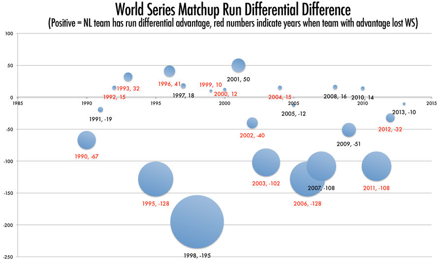 The Red Sox and Cardinals led the AL and NL in run differential this season, and now they're in the World Series. This is very far from breaking news, but still, it's the first time that's happened since 2007. To celebrate (kind of), Stats in the Wild put together a few fun bubble charts showing the run differentials of every World Series since 1990.